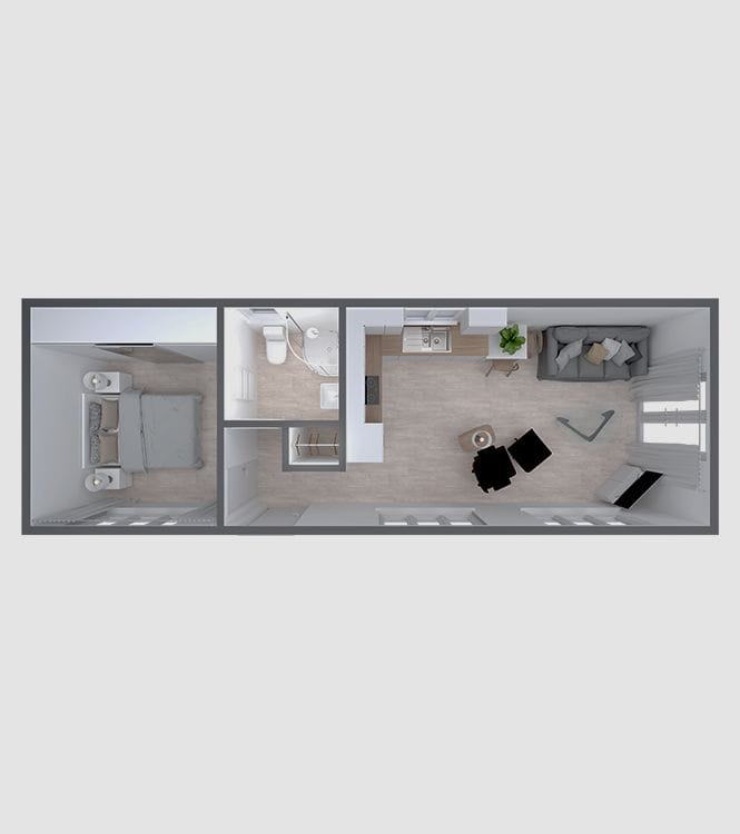 Our second featured Premier Annexe demonstrates versatility and elegance. The layout maximises usable space, providing distinct areas for living, working, or entertaining while maintaining a cohesive, contemporary aesthetic.