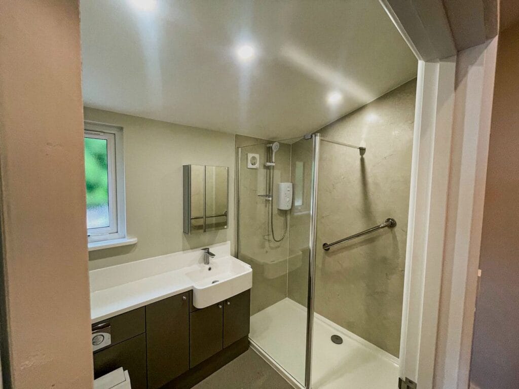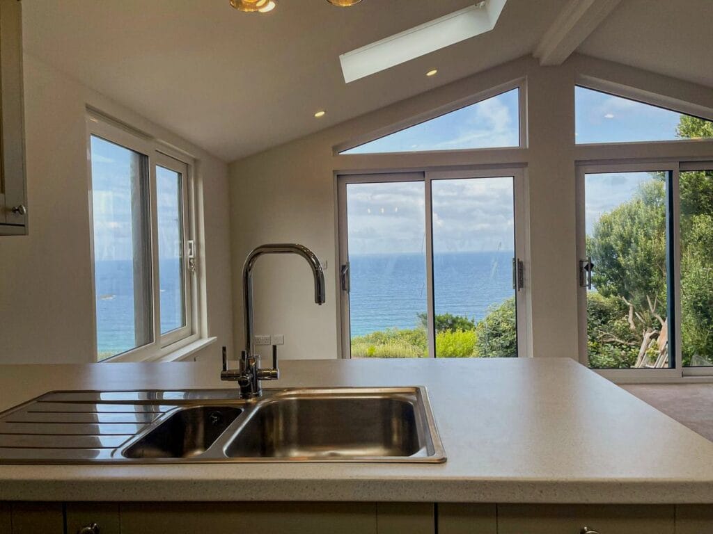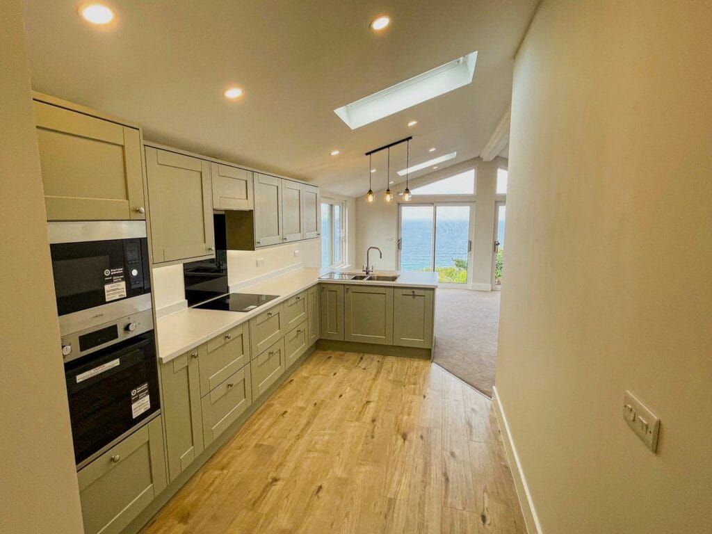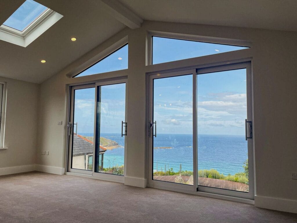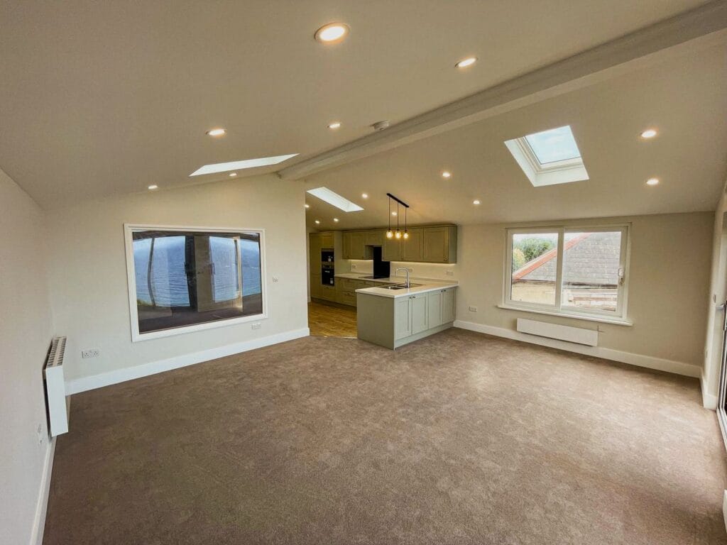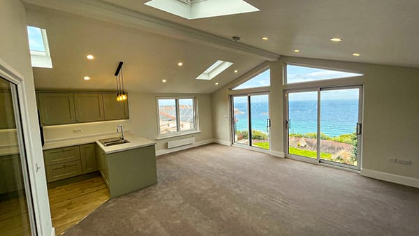 Take a 360° virtual tour of our three-bedroom annexe in Penzance, featuring a flexible layout where one bedroom doubles as a study. The annexe includes an en-suite, a separate shower room, and an open plan kitchen and lounge. Large sliding doors frame stunning views of Sennen Cove and the Atlantic Sea, bringing light and coastal scenery into the home, and opening onto the area planned for a future deck.