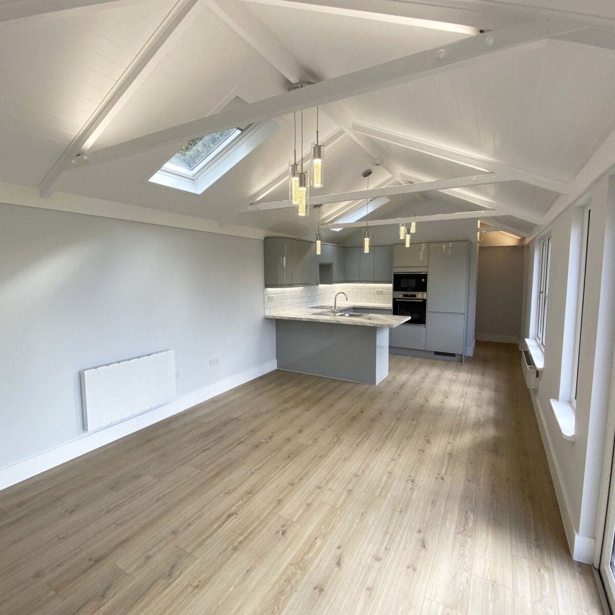 The U-shaped kitchen is carefully arranged to keep the kitchen connected to the lounge, allowing the customer to remain part of the social space while cooking or entertaining. Carefully chosen materials, stylish interiors, and considered planning ensure the annexe is both practical and visually refined. Large windows and French doors bring in natural light and create a strong connection between the interior and the garden beyond.
